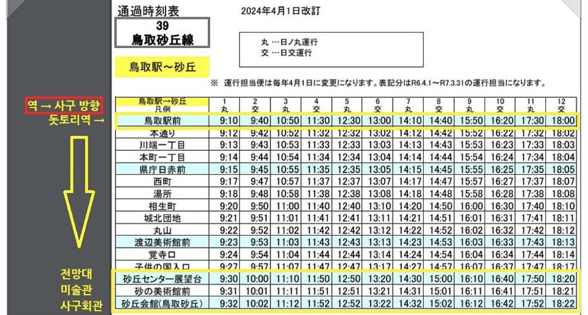 그래서 그냥 한달 정기권 뭐 그런 건가보다ㅡ했다. 한참 열심히 가는데 거의 다 도착한 느낌이었다. 8번째 정류장 어쩌고 했던 게 기억이 났고, 돗토리사구 어쩌고 하는 방송을 들어서 내리려고 주위를 둘러봤는데 외국인도 그렇고 여기저기 둘러봐도 내리는 사람이 없는데 그냥 일단 내렸다. 알고 보니 돗토리사구전망대였다.