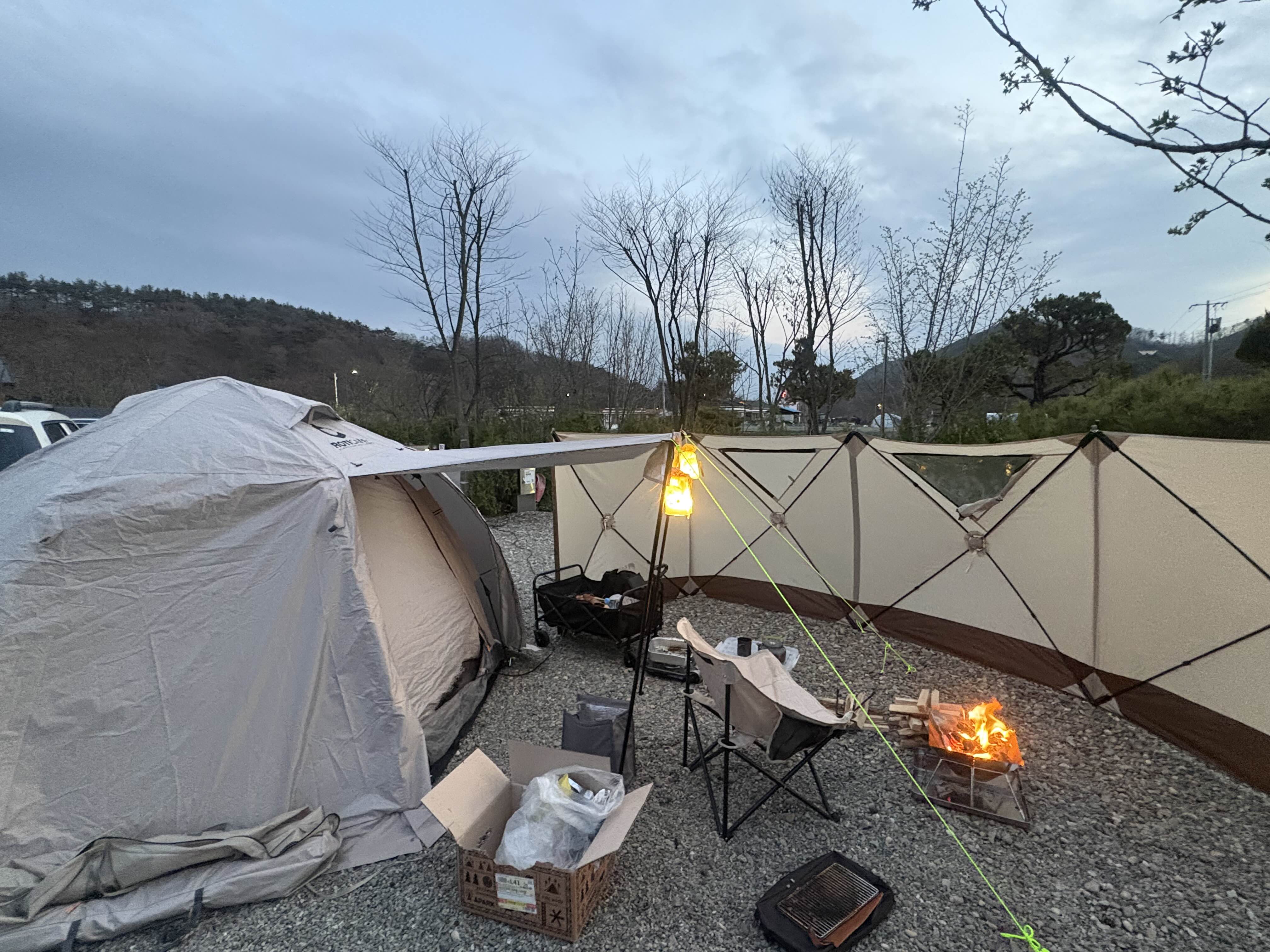 텐트가 작은데 전기난로, 전기장판까지. 난방기구를 은근 잘 챙겨 온 거 같디.